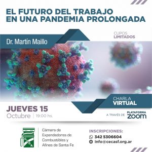 Estimado Asociado, lo invitamos a la Charla: EL FUTURO DEL TRABAJO EN UNA PANDEMIA PROLONGADA, dictada por el Dr. Martín Maillo, el próximo JUEVES 15 de OCTUBRE a las 19 hs. La misma se llevará a cabo a través de la Plataforma ZOOM. 👉👉 Lo invitamos a que nos envíe sus INQUIETUDES o TEMAS que desee que el Dr. Maillo aborde durante el encuentro. Recibimos las sugerencias hasta el martes 13.