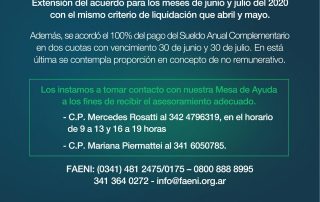 Estimado Asociado: Le informamos que FAENI ha logrado la extensión del plazo del acuerdo homologado con el Sindicato Obrero de Estaciones de Servicio, Garages, Playas y Lavaderos Automáticos (SOESGPYLA) y el Ministerio de Trabajo de la Provincia de Santa Fe el 7 de mayo del 2020, para los meses de